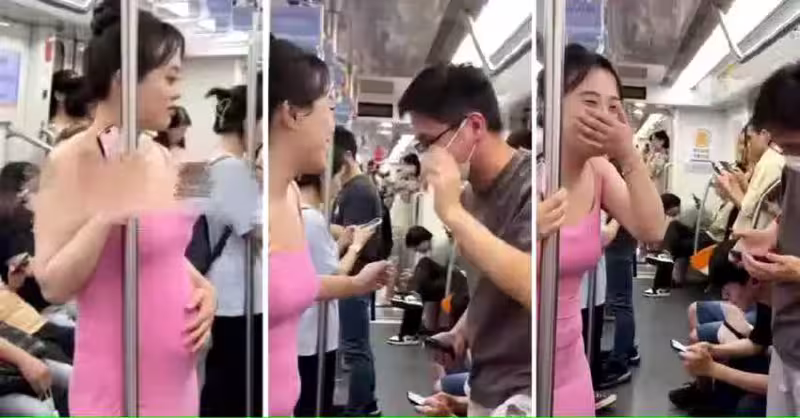 在這個懸念迭起的視訊中,捷運運里的小伙子看到一位穿著粉紅色的女士,她懷孕了,於是熱情地讓座。