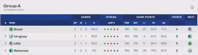 所以倘若小組賽收官戰美國男籃不敵巴西就有可能無緣出線,但也有可能晉級,只要保證自己最終能排在小組第三,且不是3個小組第三中成績最差的隊伍即可。