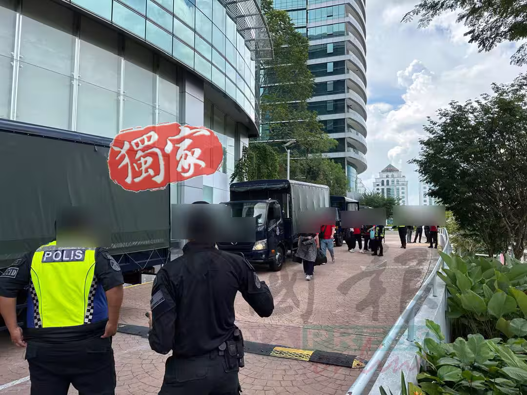消息透露,警方在至少5個樓層展開突擊,並在整個行動中,扣查上百名男女,並出動至少7輛警用大卡車到場,分批次載走大批男女返回警局作深入調查。