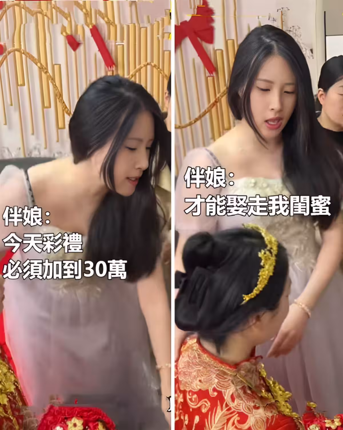 最近網絡上有段影片爆紅——新娘結婚當天穿好禮服,開開心心等老公來接親,結果旁邊的閨蜜竟然臨時起鬨,叫她加碼要彩禮,還說:「你現在不加,以後什麼都拿不到!」結果新娘只說一句話,直接讓閨蜜當場閉嘴,超有Guts!