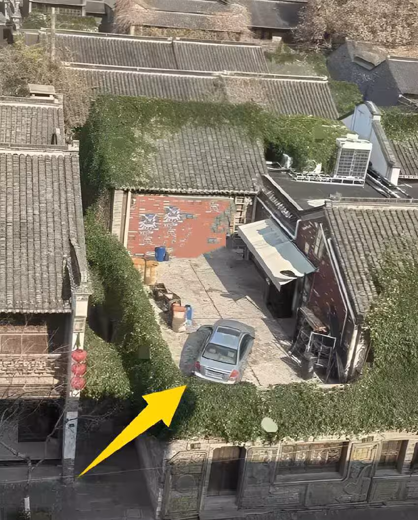 照片中,一輛銀色轎車停在一座古色古香的庭院中,周圍是四面圍牆和傳統建築的屋檐,看上去根本沒有足夠寬敞的大門讓汽車駛入。