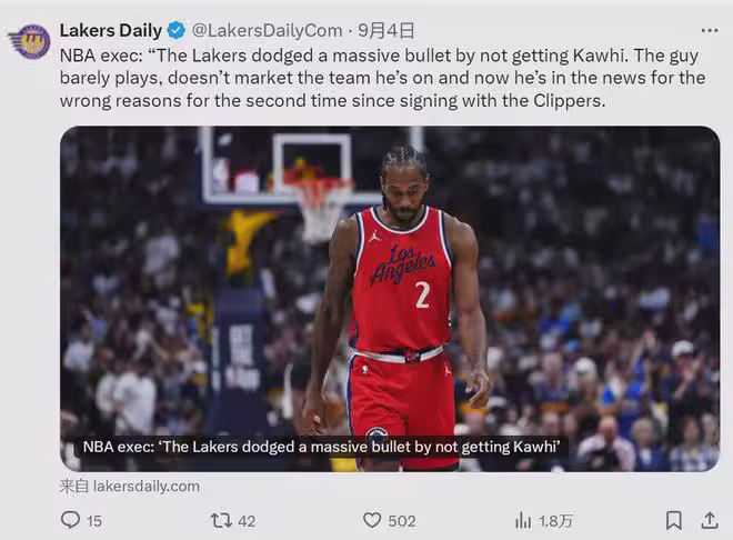 NBA聯盟正在調查快船和倫納德陰陽合同事件,目前還沒有進展。一位NBA球隊高管,接受湖人媒體Lakers Daily採訪時說道:「當時湖人非常想簽下倫納德。這個傢伙幾乎不打球,現在看來,湖人沒能得到倫納德,算是逃過一劫。」