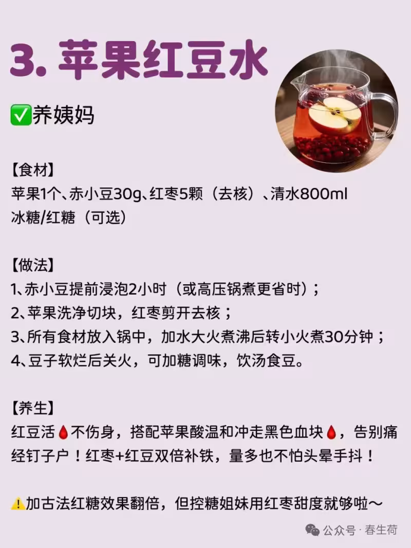 赤小豆提前浸泡 2 小時,蘋果洗凈切塊,紅棗剪開去核,所有食材放入鍋中,加 800ml 清水大火煮沸後轉小火煮 30 分鐘,豆子軟爛後關火,可加糖調味,飲湯食豆。