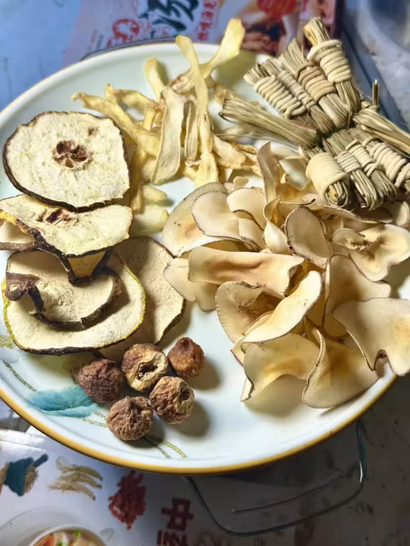 雪梨片8片、無花果5顆、海底椰20克、玉竹20克、燈心草一把、骨頭500克