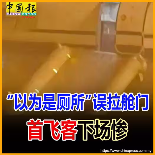 (北京7日綜合電)中國浙江衢州機場發生一起罕見意外。一名首次搭乘飛機的旅客張某,誤將中國國際航空(國航)航班的應急艙門當作洗手間門打開,導致應急滑梯自動釋放,造成航班取消,經濟損失逾11萬元(約6.5萬令吉)。事後,國航將張某告上法院,日前一審判決結果出爐,張某需承擔主要責任,賠償金額達人民幣7.7萬元(約4.55萬令吉)。