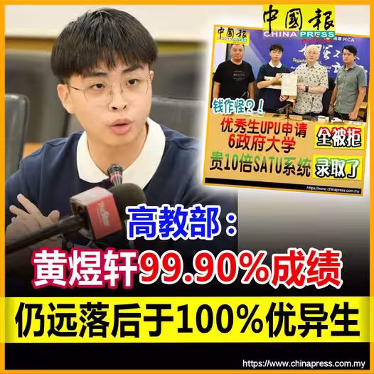 來自檳城日新華中的黃煜軒,日前通過馬華總會長拿督斯里魏家祥召開記者會投訴,他在STPM考試獲得4.0滿分,在總分10分的課外活動評估中獲得9.9分,但仍被6所政府大學的會計系拒之門外。