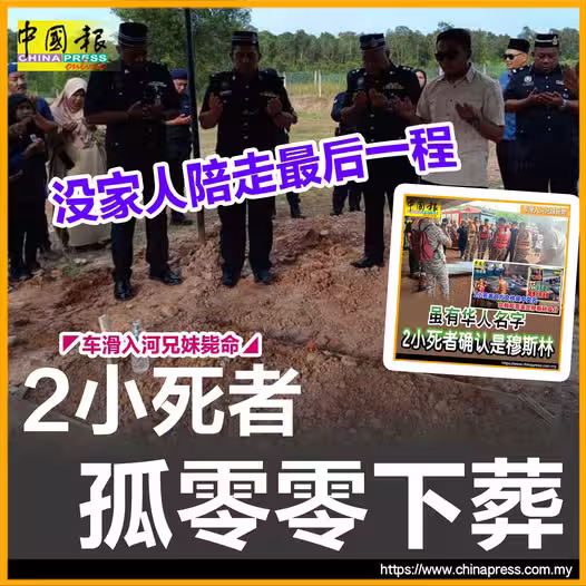 (波德申9日訊)車滑入河兄妹斃命案兩名小死者,在沒有家人或親屬出席之下今午完成葬禮,兩名小死者的父親則被押送在車內觀望下葬過程。