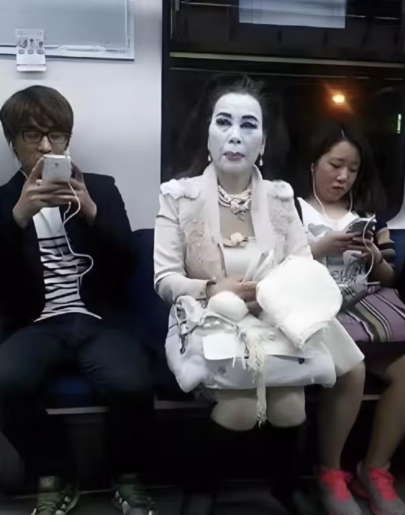 哇哦!!捷運驚現恐怖「白臉女子」,眼尖網友發現她脖子「1細節」後狂刷:快報警