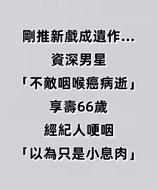 剛推新戲成遺作…資深男星「不敵咽喉癌病逝」享壽66歲 經紀人哽咽「以為只是小息肉」
