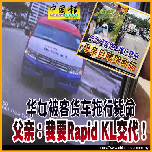 日前華裔女子在隆市舊古仔路被客貨車拖行撞斃一案;溫姓女死者的父親控訴,幼女是被Rapid KL的接駁客貨車撞死的。