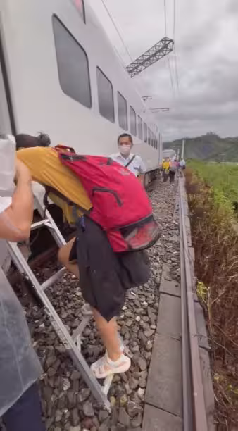 台鐵啟動列車接駁,旅客從火車上搭梯子下車。圖/民眾提供