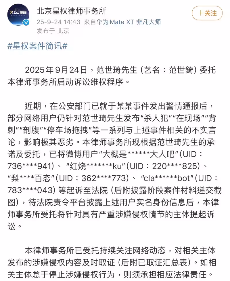 而工作室再次轉發律師聲明,並公開了范世錡在於朦朧墜樓前後兩天的行程,都在忙著演唱會,並表示在網傳謠言爆發之後,第一時間取了監控以作證明。