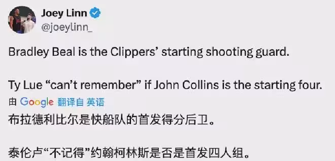 泰倫盧:快艇首發五虎已確定4位,分別是哈登+比爾+倫納德+祖巴茨。