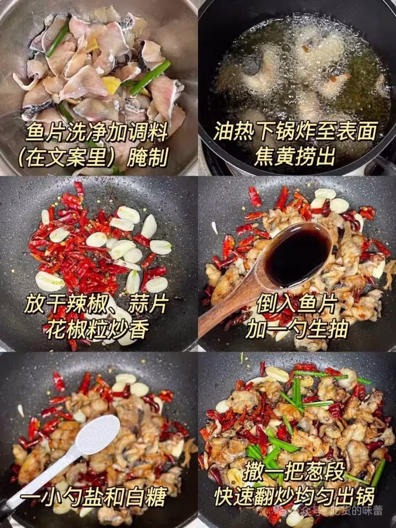 2、油溫六七成熱(放筷子有密集小泡)魚片下鍋炸至表面金黃撈出,鍋里放干辣椒、蒜片、花椒粒炒香,倒入魚片加一勺生抽,一小勺鹽和白糖,撒一把蔥段快速翻炒均勻出鍋