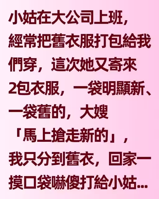 小姑在大公司上班,經常把舊衣服打包給我們穿,這次她又寄來2包衣服,一袋明顯新、一袋舊的,大嫂「馬上搶走新的」,我只分到舊衣,回家一摸口袋嚇傻打給小姑