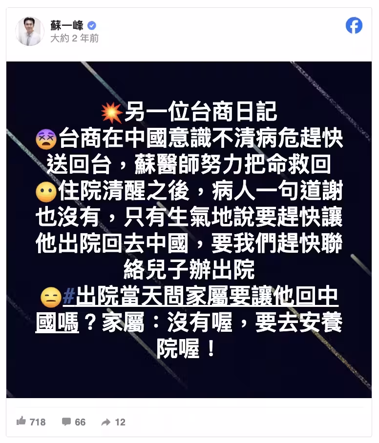 沒想到阿伯心心念念出院後就回中國,卻會被家屬送到安養院,讓人不勝唏噓,蘇一峰不禁感嘆:「不知道阿伯現在在安養院過得還好嗎?」網友看了也紛紛搖頭:「可能是有2345奶在那邊等他」、「好誇張呦!居然沒有感謝『救命恩人』,連最基本的『謝謝』都沒有,真的讓人心寒」、「他的病不在肺,在腦」、「他是因為腦子不好使,導致的意識不清吧!腦霧嚴重」。