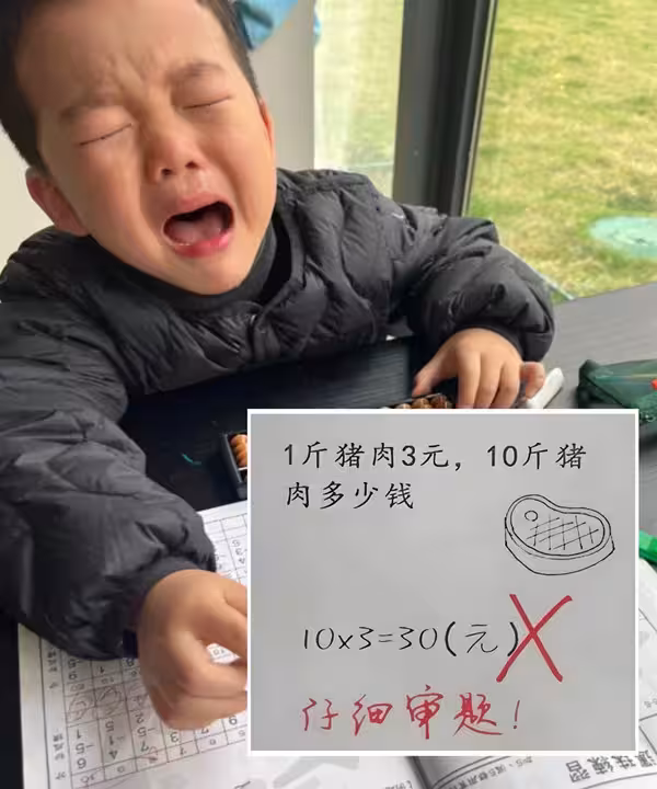 周五晚上,李媽媽發現兒子小浩的數學作業本上赫然打著一個紅叉,題目「一斤豬肉3元,十斤多少錢?」旁邊是孩子工整的答案「10×3=30元」。