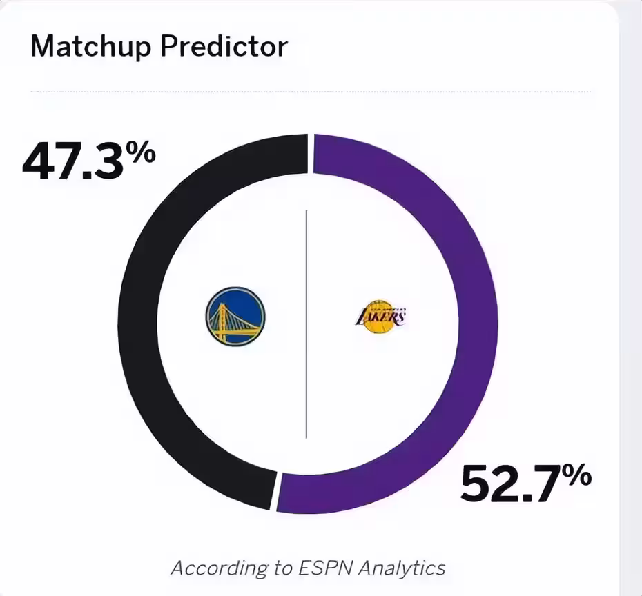 綜合來看,湖人與勇士的揭幕戰,小編還是看好勇士取勝,不過這裡還要考慮一個重要因素,那就是主場因素,最近兩個賽季湖人都是主場戰績最好球隊之一,他們的主場優勢非常明顯,而這場揭幕戰是在湖人主場進行,ESPN也給出了勝率預測,他們認為湖人贏球的機率是52.7%,勇士贏球的機率是47.3%。那麼關於湖勇大戰這場揭幕戰,你們有什麼想說的歡迎評論區討論!