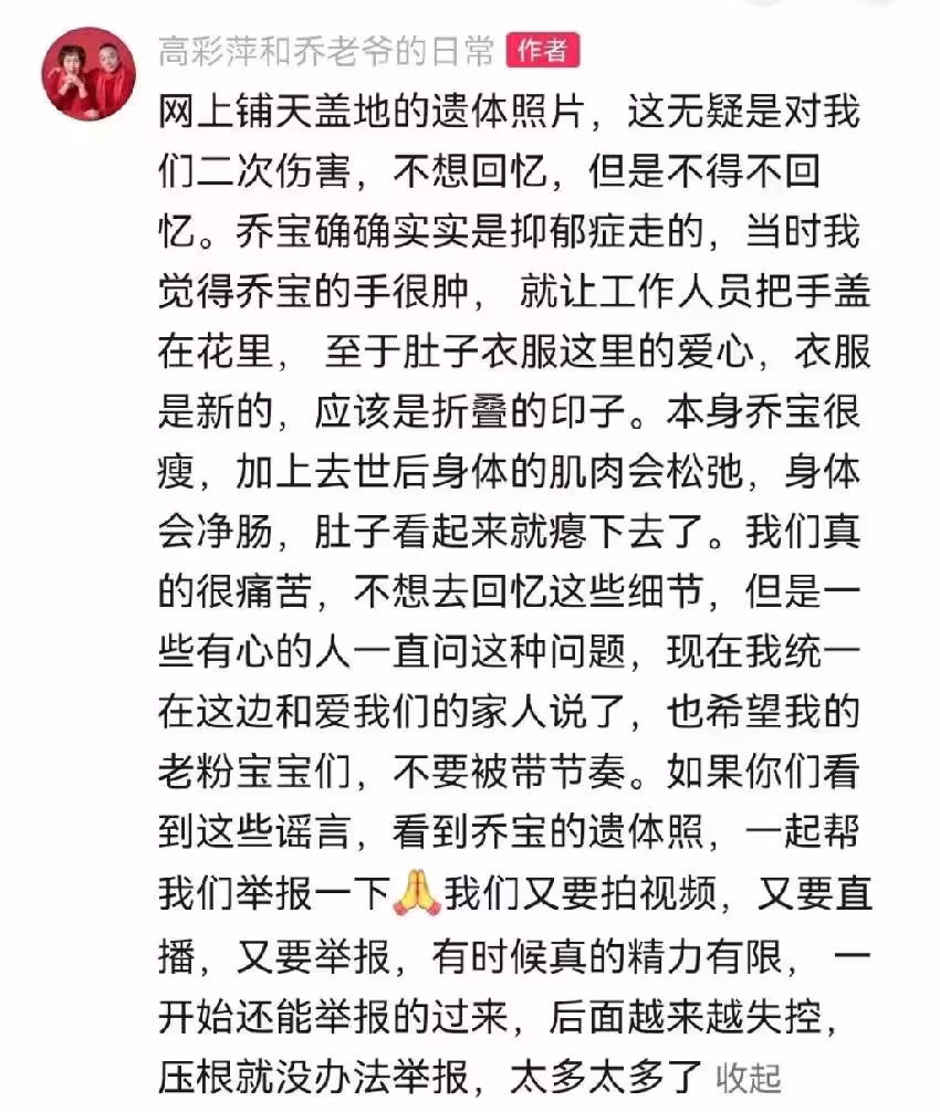 兩老期盼外界不要再散布喬任梁的遺體照,希望網友幫忙看到謠言或照片就立刻檢舉,不然場面可能會越來越失控。