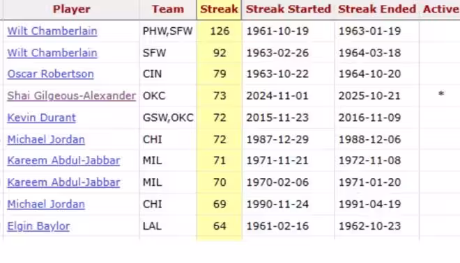 歷史第一還是屬於張伯倫,他在美國時間1961年10月19日到1963年1月19日期間,達成了常規賽連續126場比賽得分20+壯舉,亞歷山大想打破這個紀錄難度很大,畢竟目前還差了53場之多。