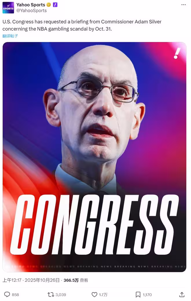 10月26日,據雅虎體育報道,美國國會下屬的眾議院能源與商業委員會,針對NBA最近一系列的賭博醜聞展開調查:NBA總裁亞當-蕭華必須在10月31日之前,對此事作出彙報。蕭華回應,自己對該指控「深感震驚和不安」。