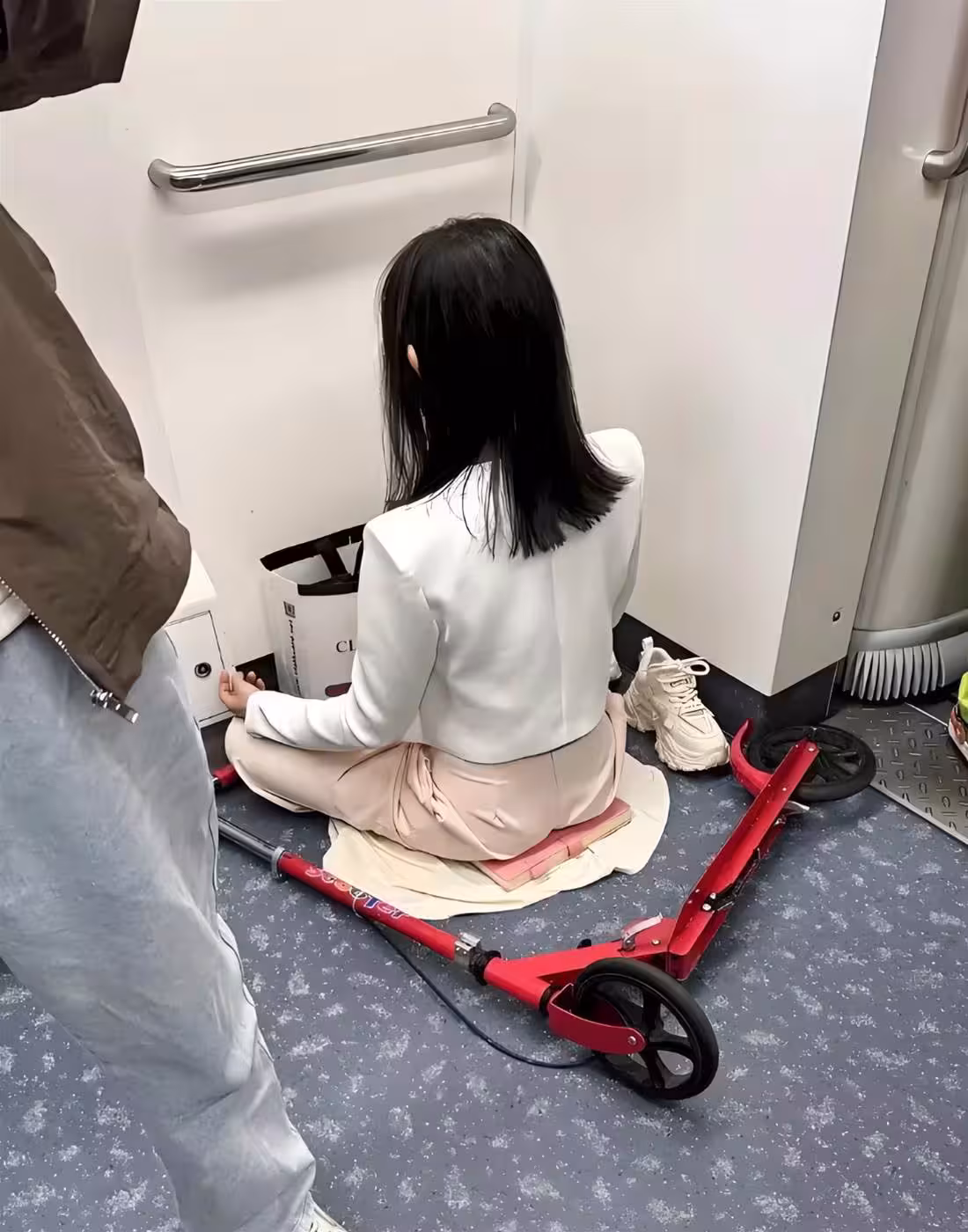 車廂驚見「地板打坐妹」,眼尖人一看「屁股下坐墊」:此人不簡單!