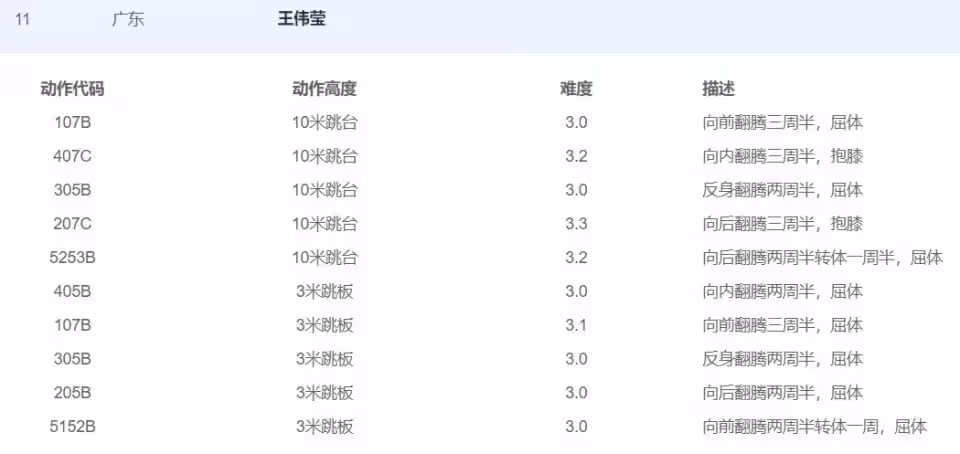 進入到3米跳板的角逐,王偉瑩5輪動作分別為405B、107B、305B、205B和5152B。第6輪和第7輪王偉瑩69.00和69.75單跳均排名第2位,掌敏潔憑藉著兩跳72.00和74.40分的成績縮小了同前2名的差距。