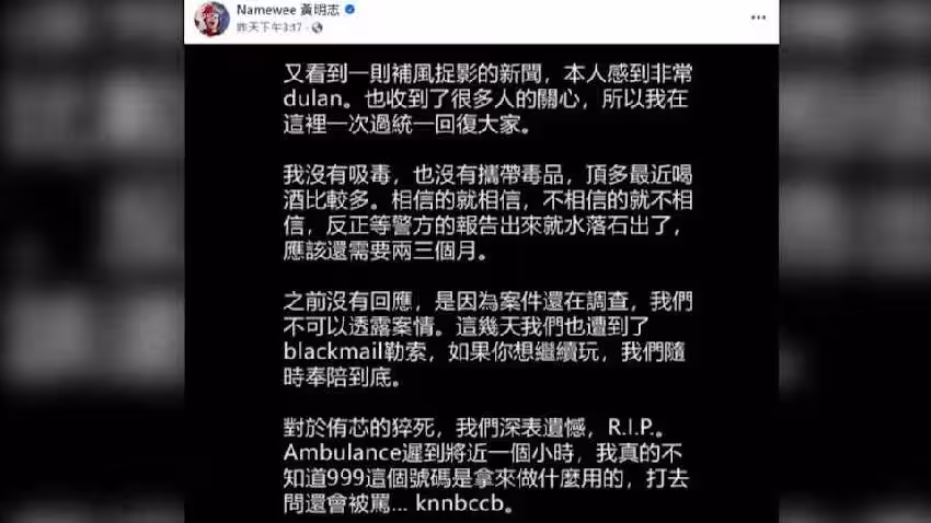 黃明志最新貼文仍停留在2號,針對外界質疑,暫時沒有更新回應。