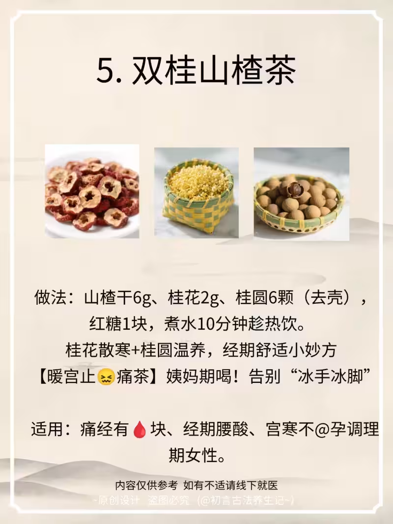 做法:山楂干30g(炒焦更佳)、生薑切片10g、紅茶10g,沸水煮5分鐘加蜂蜜調味。