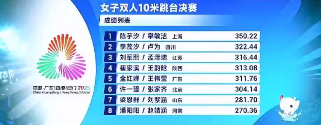 北京時間11月6日晚,全運會女子雙人10米台決賽,上海隊的陳芋汐/掌敏潔350.22分奪冠,四川隊的李蕊汐/盧為322.44分銀牌,江蘇隊的劉軍熙/孟澤瑞316.44分銅牌,而廣東隊的全紅嬋/王偉瑩只拿到311.76分最終是第五。