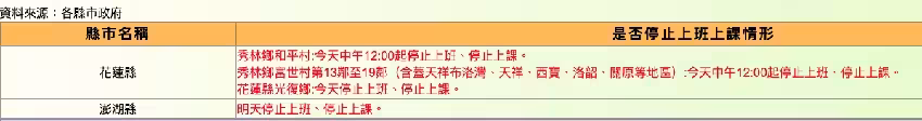 面對颱風來襲帶來的威脅,花蓮縣與澎湖縣政府率先於傍晚宣布停班課消息!花蓮縣政府指出,由於明日24小時的累積降雨量已經達到停班停課的標準門檻,因此宣布11月11日全縣實施停班停課措施。