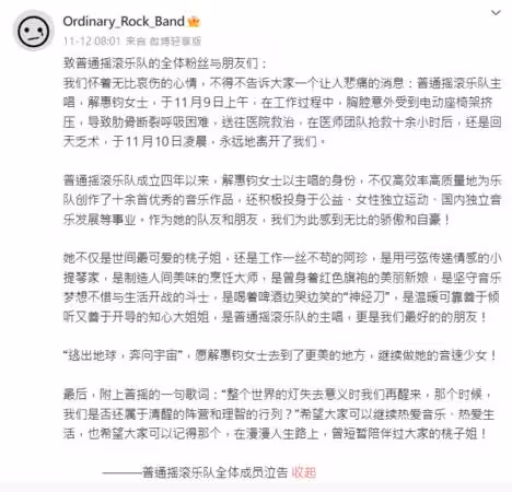 團員們引用樂團歌曲中的詞句,期盼解惠鈞已前往更美好的地方,並希望歌迷能繼續熱愛音樂與生,記得這位曾陪伴大家的「桃子姐」、「音速少女」。