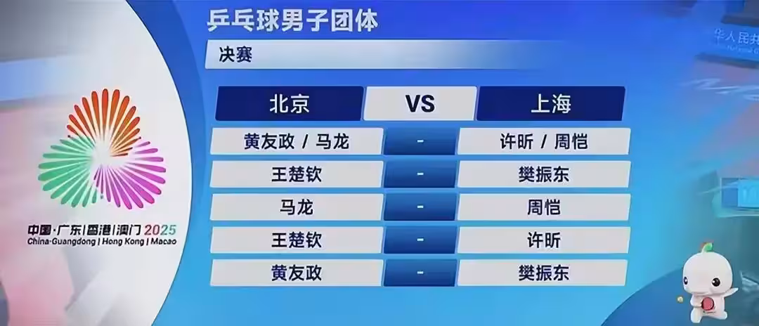 第四盤 單打:王楚欽 3-0 許昕(11-8、12-10、11-8),北京以總比分3-1鎖定金牌。以上為官方賽後技術統計與主流媒體戰報匯總。