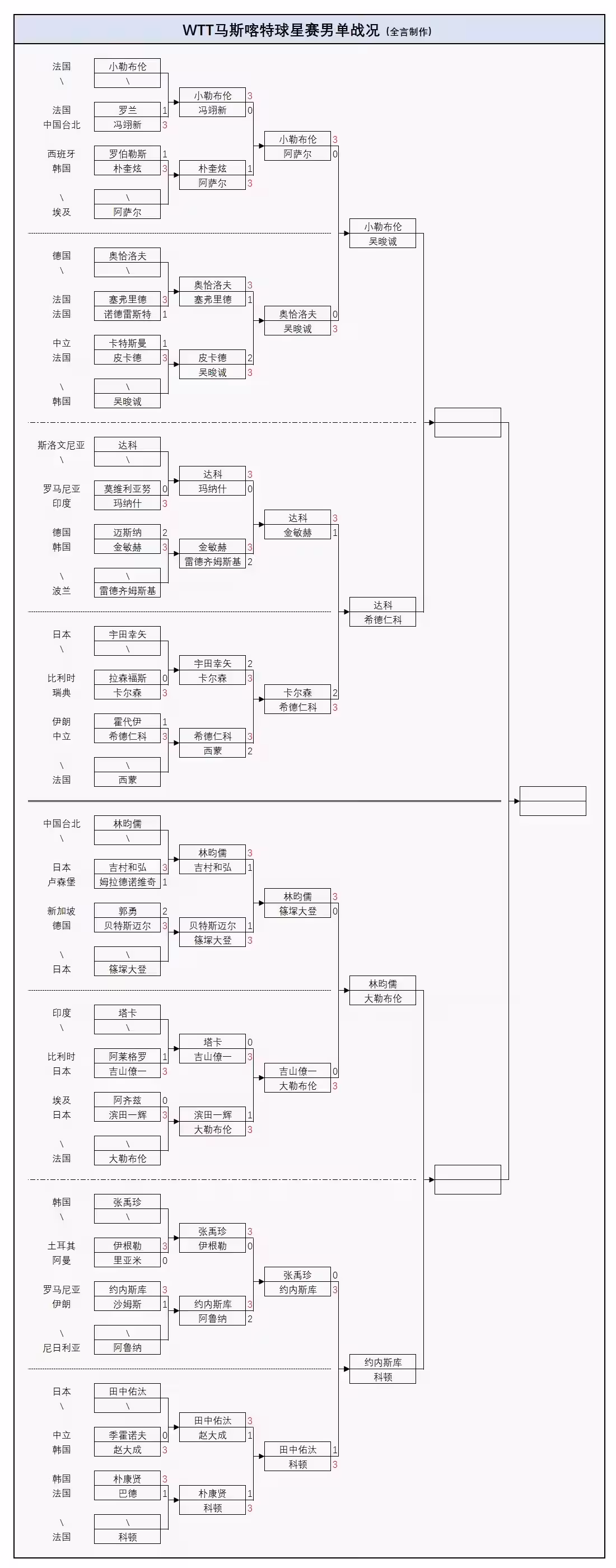 北京時間11月21日,桌球WTT阿曼馬斯喀特球星賽繼續進行,目前男單1/8決賽已經全部結束,在國乒無人出戰的情況下,日本隊已經在該項目上全軍覆沒輸光,亞洲最終僅韓國、中國台北各1人過關,歐洲則有6位運動員入圍,其中法國3人晉級最多,斯洛維尼亞、羅馬尼亞、俄羅斯中立選手各1人,3位世界冠軍被淘汰,詳細戰況請看下文。
