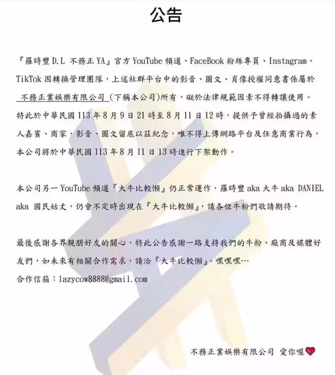 羅時豐無預警發出宣告,表示因轉換管理團隊,原本頻道《羅時豐DL.不務正Ya》的影片會全面下架,訊息一出不僅觀眾錯愕不已,頻道製作人侄子張敏慎表示自己也是同一時間得知這個訊息,對此有許多合作店家們力挺張敏慎,暖心喊話:「挺你到底!加油」、「你的優秀不能被埋沒,你的善良不能被掩蓋,你的努力我們都看見了!」讓張敏慎看了忍不住哭出來!
