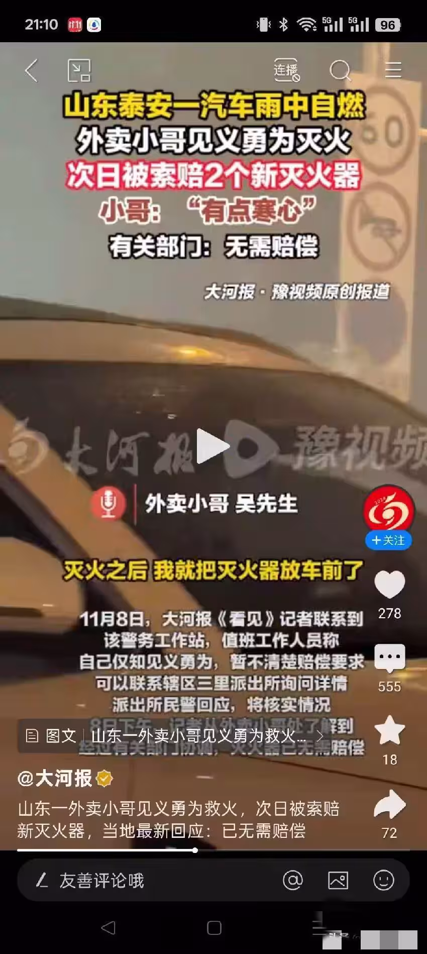 車輛自燃外送小哥「挺身救火」!次日被索賠新滅火器...讓他寒心,警方已回應