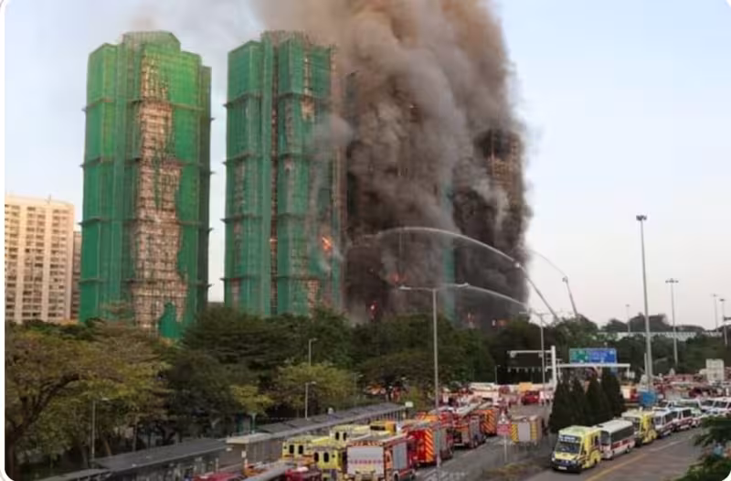 昨日下午疑似有煙蒂點燃鷹架外層的防護網,火苗順著鷹架結構快速竄升,加上當時風勢強勁,燃燒中的鷹架碎片四處飛散,導致鄰近建築的鷹架也接連起火,並引燃大量住宅內部。