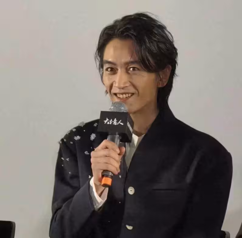 他留著長發,身穿深藍色西裝,卻瘦得「脫相」。