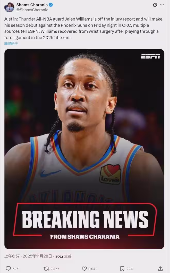 11月28日上午7點,據NBA名記Shams報道,雷霆二當家杰倫-威廉士正式復出,他將在明日對陣太陽迎來賽季首秀。今年休賽期,傑威因右手腕韌帶撕裂接受手術,本賽季一場都沒打過。目前雷霆18勝1負,高居聯盟第一!