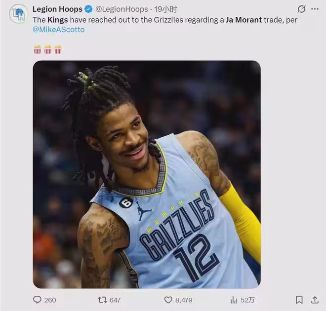 據NBA記者Michael Scotto報道,國王隊正式報價莫蘭特,拉文、德羅贊和小薩任灰熊選擇,但灰熊拒絕了。灰熊認為莫蘭特正處在「價值低谷」,所以不著急交易他。而且國王不肯把基根-穆雷放進交易,目前的籌碼根本打動不了灰熊。