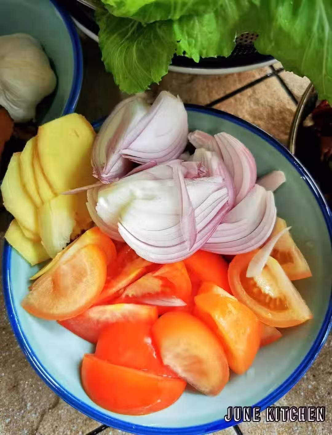 1,洋蔥,薑片,辣椒干爆香,加入番茄炒至爛,再加入芥菜炒至軟。