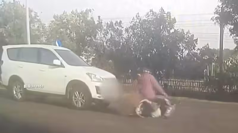 轎車駕駛行經路口放慢車速,但眼前一輛機車這時穿越路口,騎士減速後沒多久,遭到一輛直行白色轎車給撞上,騎士及后座乘客倒地後,騎士似乎還來不及爬起,但轎車卻是不斷往前行駛,也讓騎士連人帶車被推行,目擊過程的駕駛趕緊按下喇叭,這時肇事駕駛終於停下車輛,遭撞的騎士也趕緊爬起,通報救護人員到場,附近民眾說:「差不多4點多,一台白車開過去,機車要這樣過去的樣子,才會撞到。」