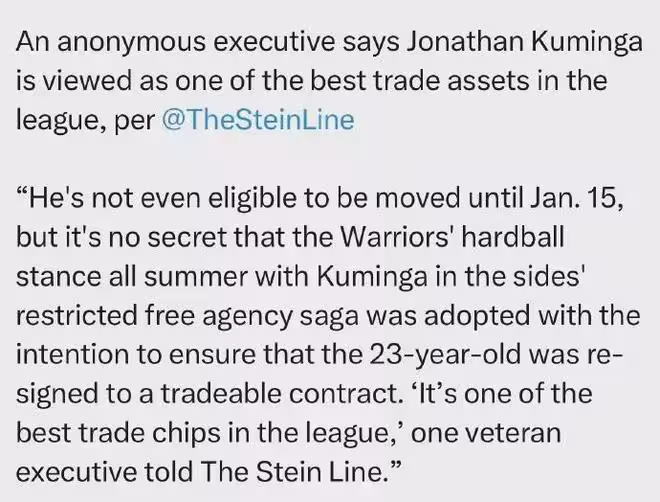 本賽季至今,庫明加出戰14場首發12次,場均上陣27.1分鐘,貢獻13.5分6.2板2.8助2.6失誤,三項命中率47.9%、33.3%和77.1%,場均籃板球為生涯新高,儘管可能與勇士註定分離,但還是比較兢兢業業,沒有整出什麼么蛾子。