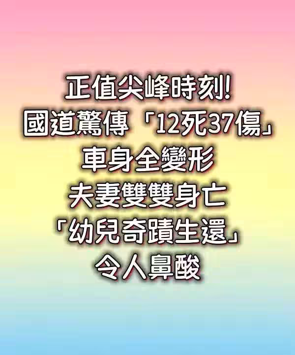 快訊/正值尖峰時刻!國道驚傳「12死37傷」車身全變形 夫妻雙雙身亡「幼兒奇蹟生還」令人鼻酸!