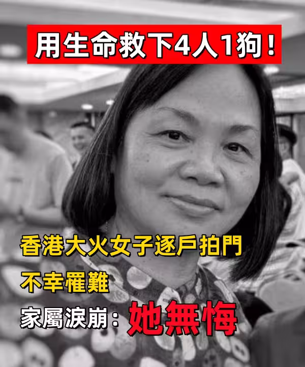 一名女住戶在逃生關頭,選擇逐戶拍門提醒鄰居撤離,最終救回4名鄰居與一隻狗,自己卻不幸罹難。