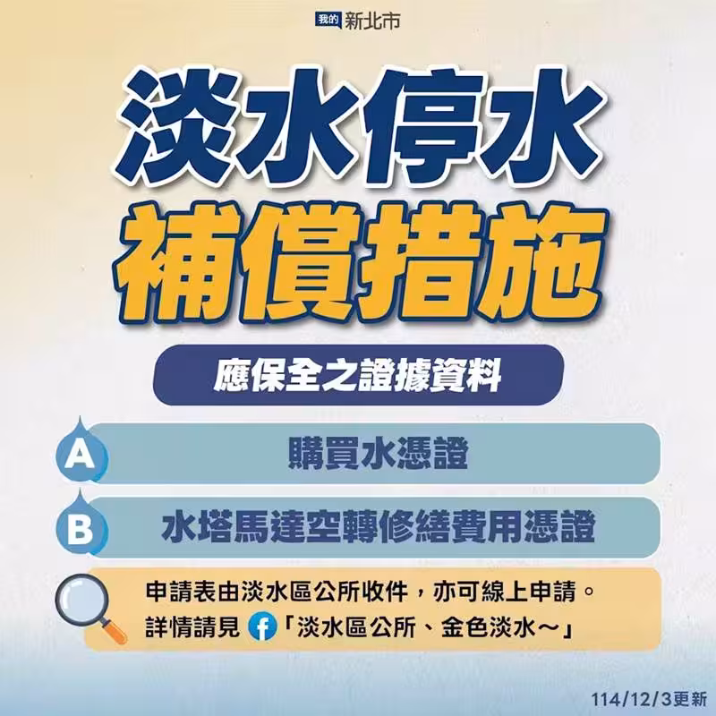 新北淡水因淡北道路施工鑽破自來水管,導致多個裡停水4天,直到昨(2)日才完全復水。新北市長侯友宜表示,一定會追究廠商疏失的責任,設立窗口受理民眾求償。而新北市府今(3)日也啟動補償機制,除了台灣自來水公司提供水費減免,民眾購買水或水塔馬達空轉修繕費用也都可以申請補償,收件時間延長至12月10日。