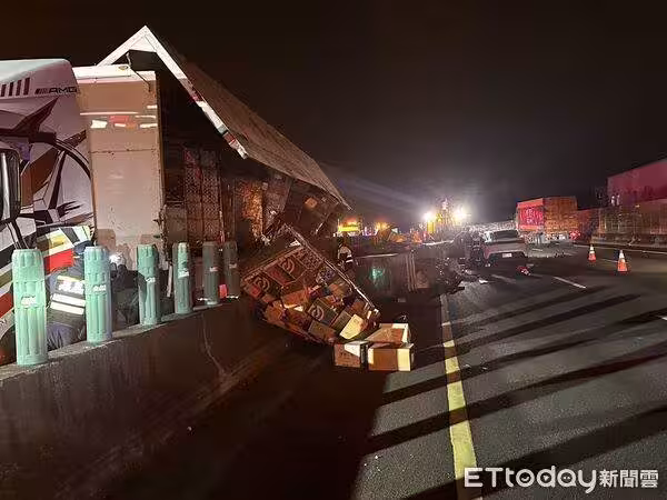 意外發生在凌晨1點11分,一輛聯結車卡在分隔島旁,旁邊一台黑色廂型車車體嚴重凹陷變形,現場散落大量汽車零件碎片、貨物及紙箱,慘烈狀況一度導致國道全線封閉。
