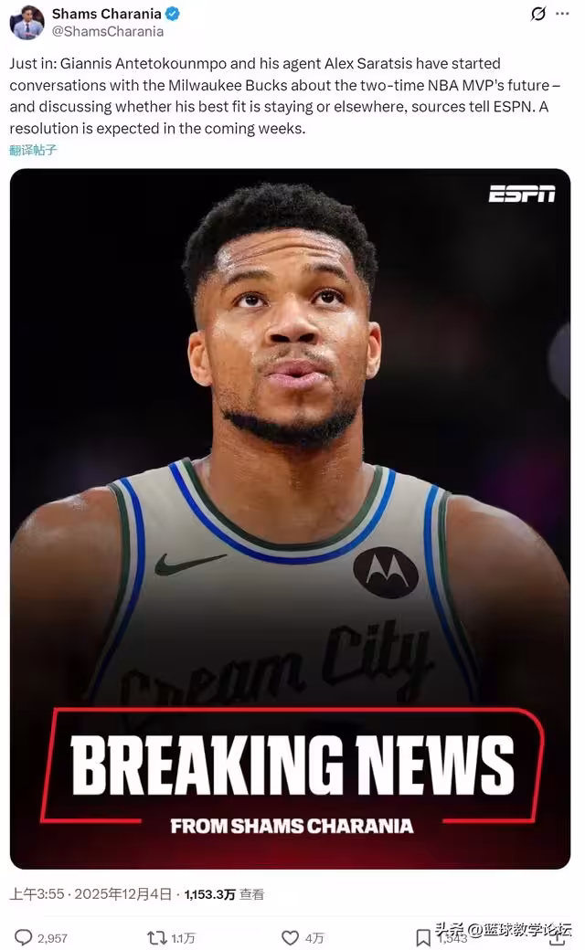 今天凌晨,據NBA名記Shams報道,字母哥和經紀人將跟雄鹿管理層展開正式會談,雙方共同探討字母哥的未來去向。Shams還表示,除非雄鹿在本賽季出現重大轉折,否則字母哥離隊已成定局,雄鹿的一個時代結束了。