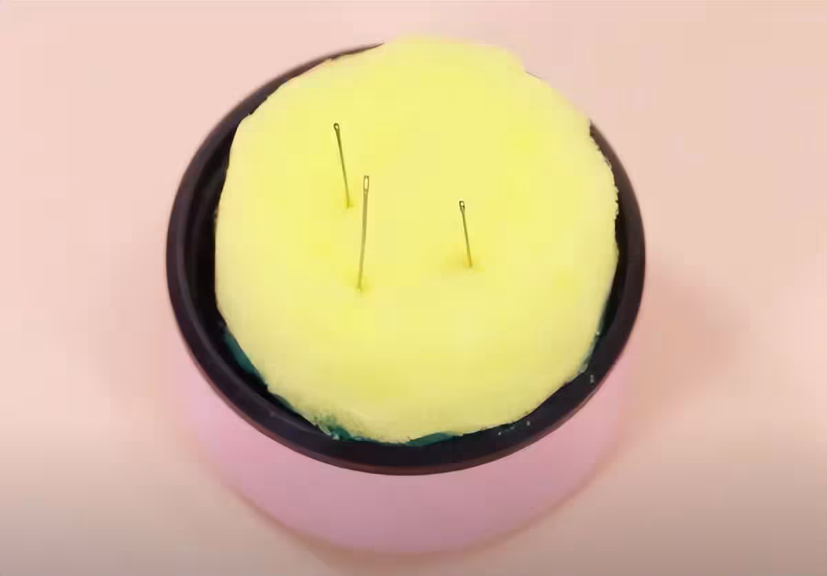 第四個用途,作為一個收納針線盒的神器。首先準備一塊百潔布,取下杯蓋子,用剪刀修剪成與杯蓋一樣大小。修剪好後,將邊緣修剪得更加美觀。接下來在保溫杯的蓋子內側粘上雙面膠,將外皮撕下來,直接將百潔布粘上去。然後將針插在百潔布上用來收納,這樣特別實用。當針全部收納好後,即使保溫杯空了,也可以用來收納線卷,同樣非常方便實用。直接裝進去,然後蓋上蓋子,一個非常完美的針線收納盒就完成了。下次你也可以嘗試一下,攜帶出門更加方便。