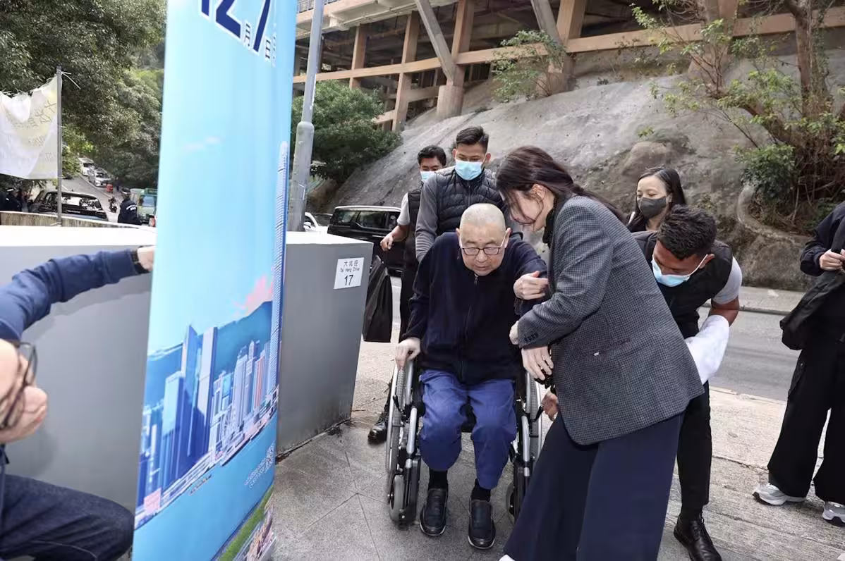 大概是因為腿腳不便,而且抵達投票站要走一個斜坡,所以劉鑾雄需要輪椅代步。在起身的時候,他顯得有點費力,甘比扶著他,保鏢在一旁助力著。劉鑾雄也不是不能行走,只是每一步都顯得小心翼翼,害怕有什麼閃失,保險起見,輪椅最穩妥。